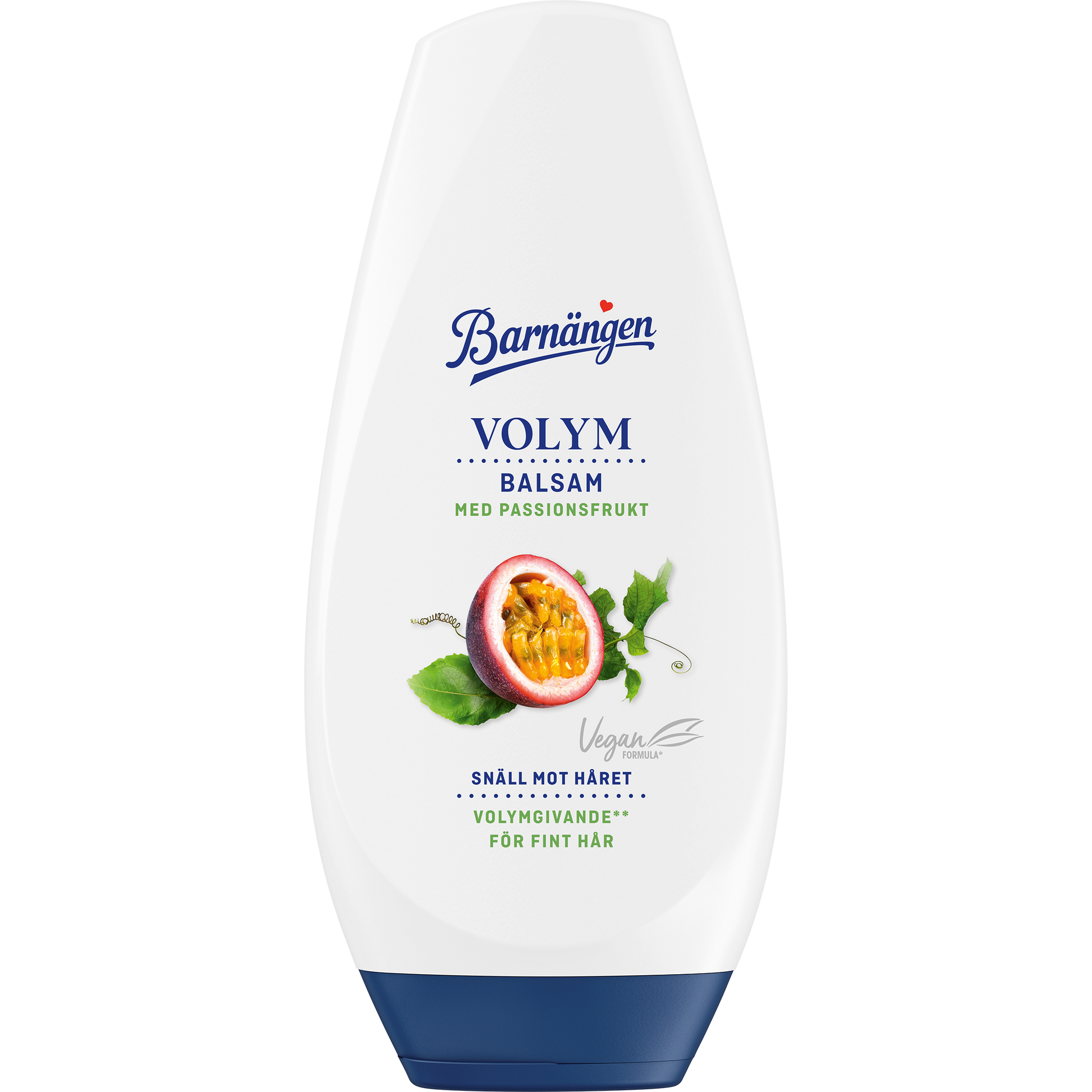 Lätt och vegansk formula (utan animaliska ingredienser) med extrakt från passionsfrukt. Vårdar och mjukgör utan att tynga ner och lämnar en fräsch känsla, för naturlig volym. Använd tillsammans med Barnängen Volym-schampo.