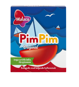 PimPim är en välkänd godisbåt som varit med sedan 1932 och är en av Malacos äldsta klassiker. Den goda båten med hallonsmak är lika populär nu som då. PimPim hallonbåtar i miniformat i ask. Godisasken innehåller 20 g. Malaco - Lördag hela veckan. Innehåll nedan:
