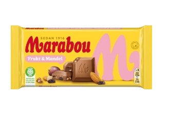Marabou Frukt och Mandel är en Marabou Mjölkchokladkaka med russin och hackade bitar av mandel. En riktig klassiker som passar för alla tillfällen.